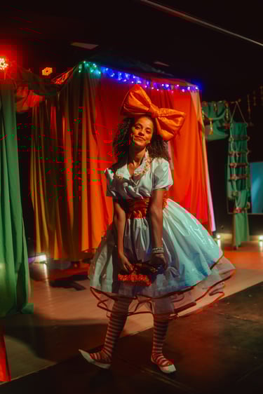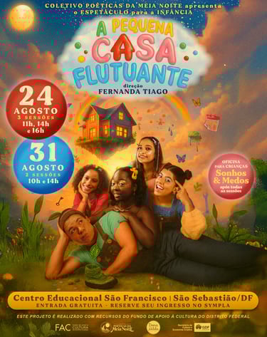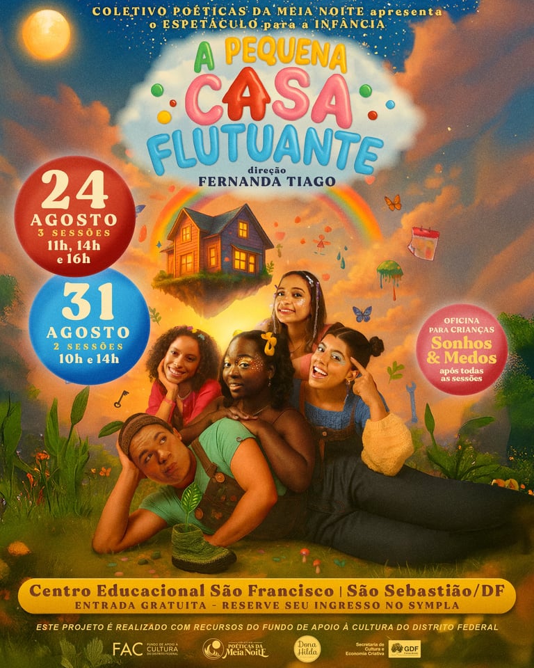 “A Pequena Casa Flutuante”, do Coletivo Poéticas da Meia Noite, acompanha a chegada da menina Lia a uma casa que atravessa o céu, habitada por quatro seres mágicos. Ao acolhê-la, esse espaço vivo se transforma, revelando uma narrativa sobre amizade, escuta e convivência. Com estética artesanal, o espetáculo propõe reflexões sobre infância, memória e o poder do imaginar
